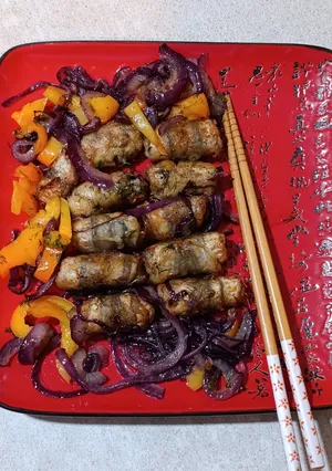 Cuộn cá trích với hành tây chiên và ớt chuôngCuộn cá trích với hành tây chiên và ớt chuông